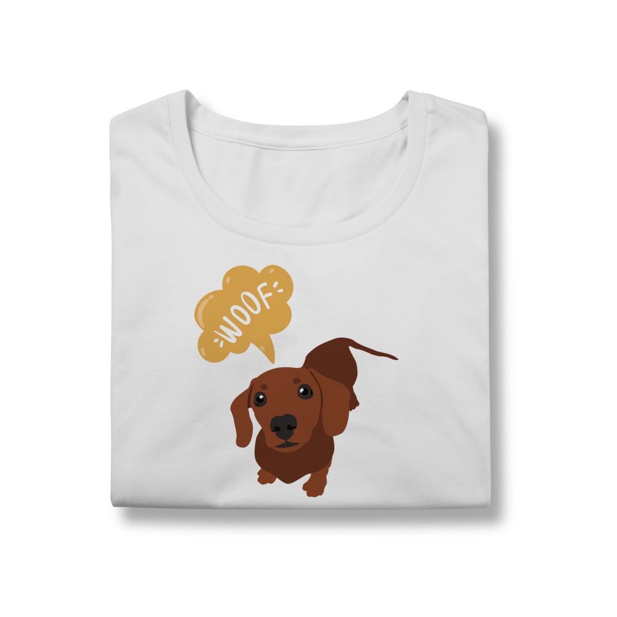 Essa estampa do dachshund marrom, dizendo “WOOF”, é puro carisma e foi feita pra acompanhar seus passeios e fotos com o dog.
