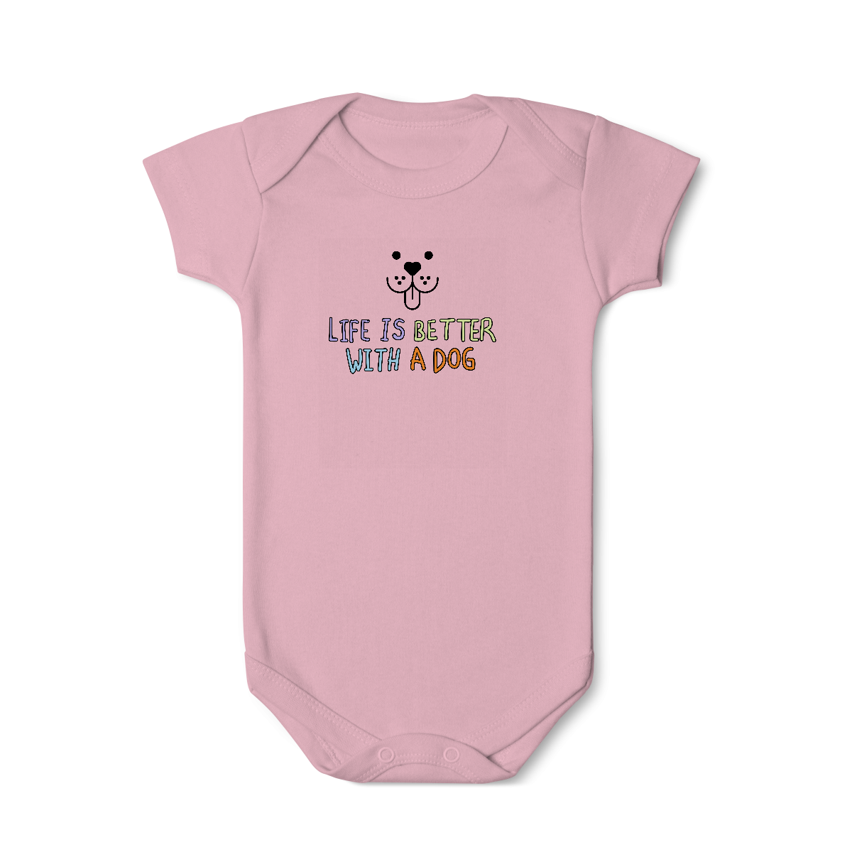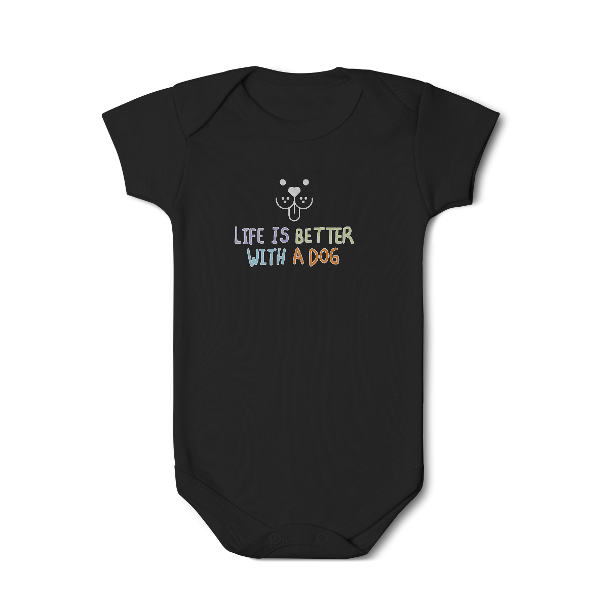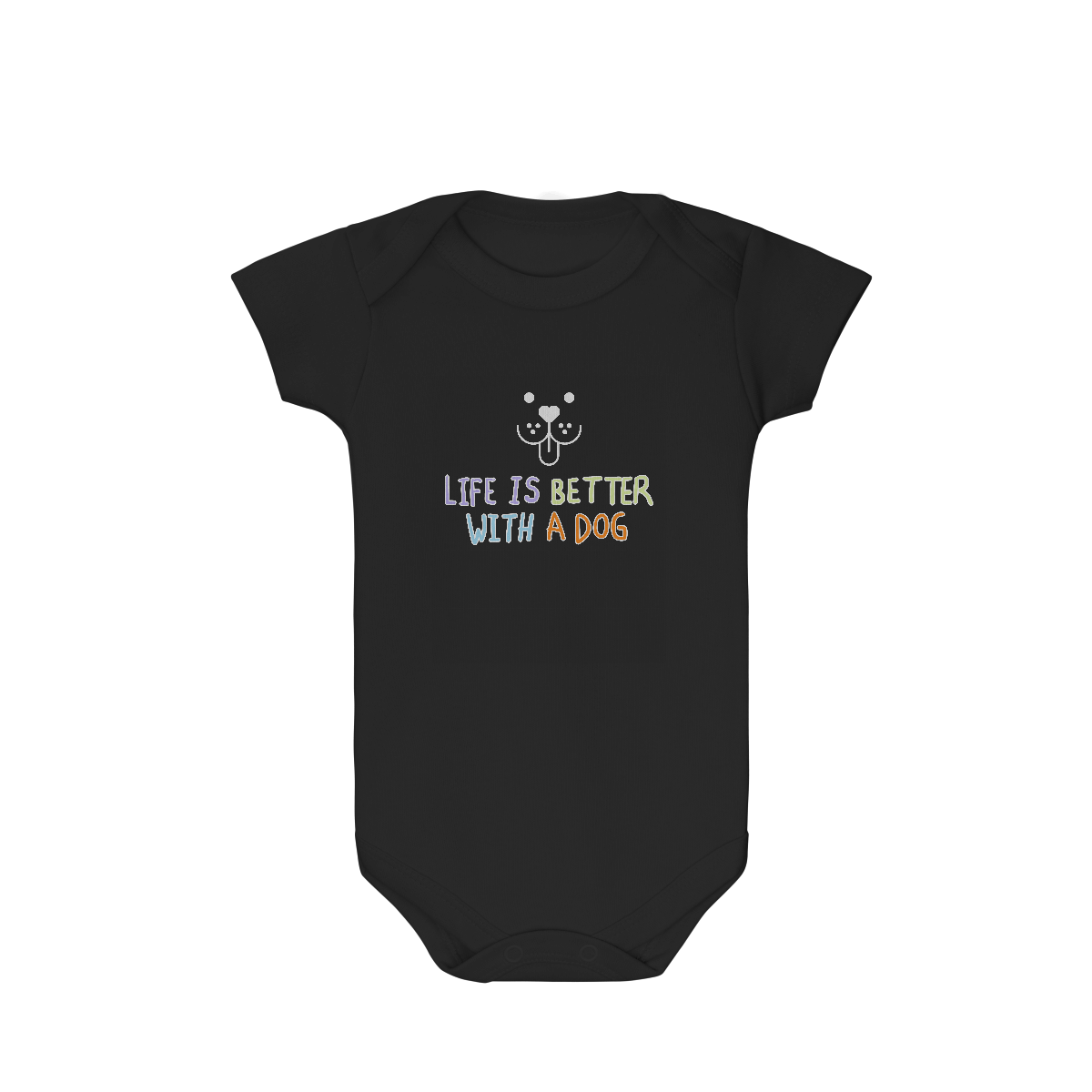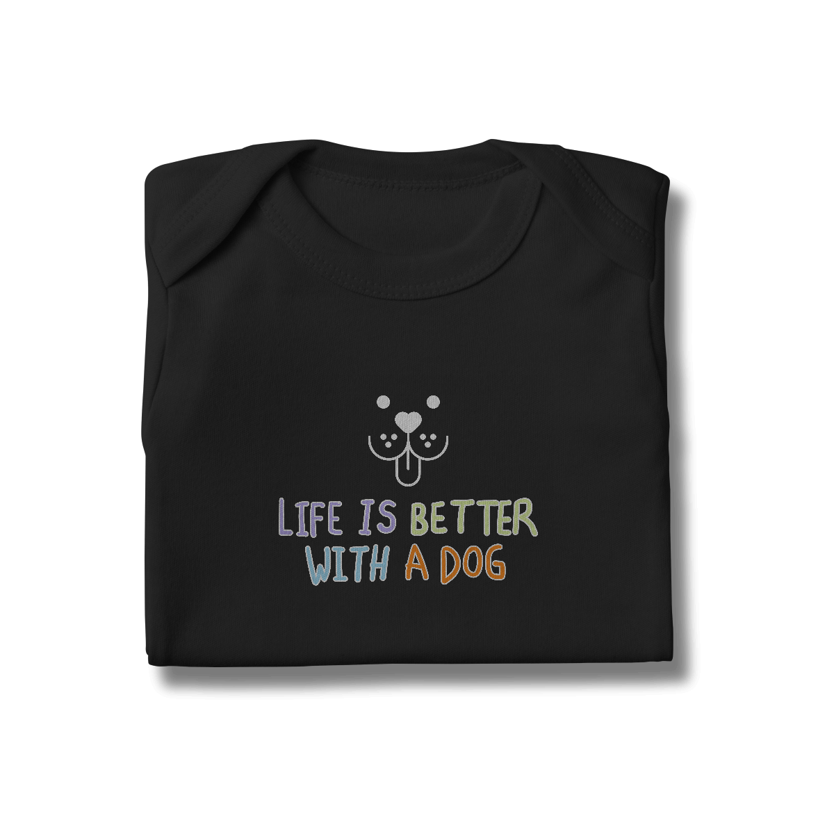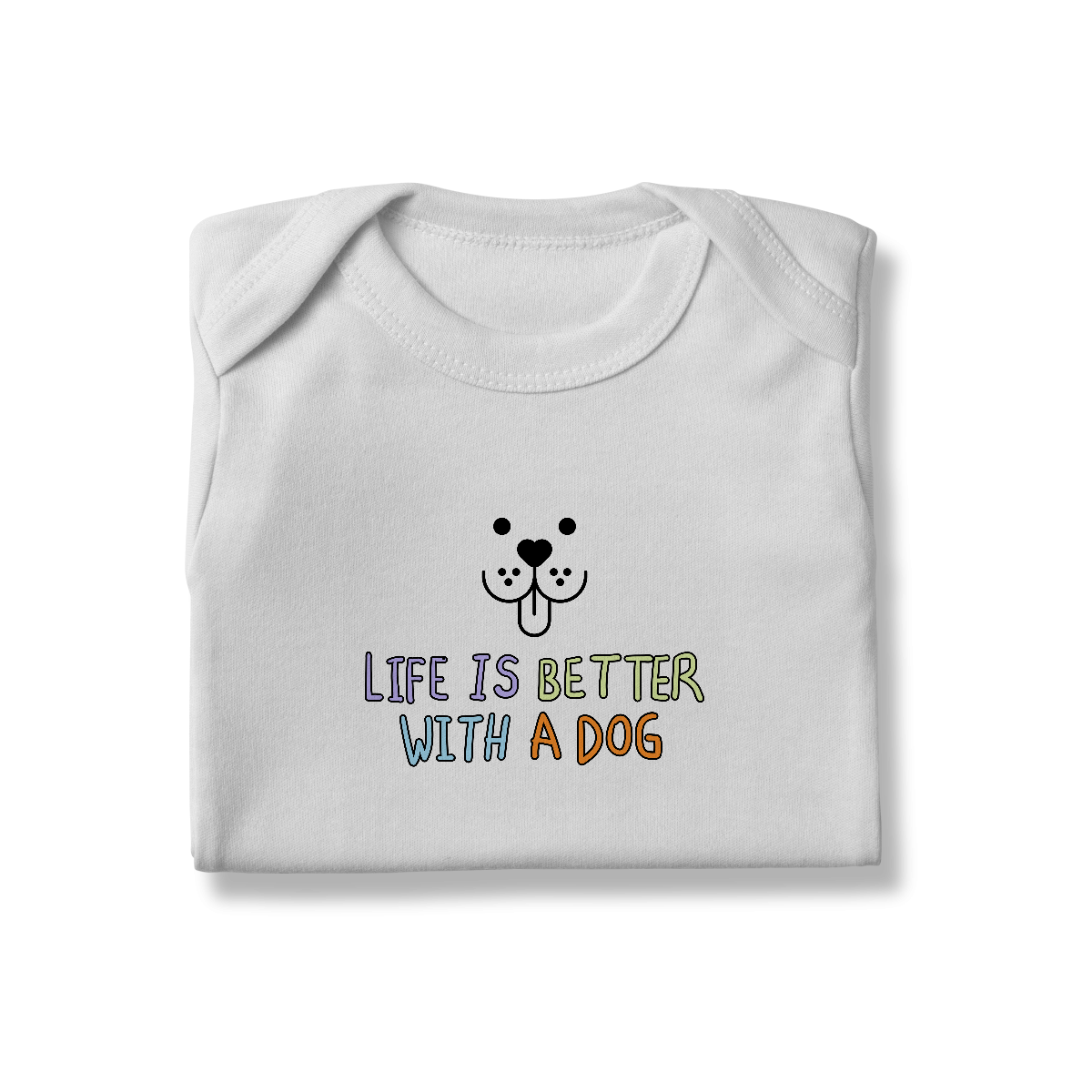 O Body Infantil – Life is Better with a Dog traz uma estampa alegre com letras coloridas e o rosto fofo de um doguinho sorridente, lembrando que a vida fica mais feliz e leve com um cãozinho ao lado. Confortável e estiloso, é perfeito para o dia a dia do bebê.