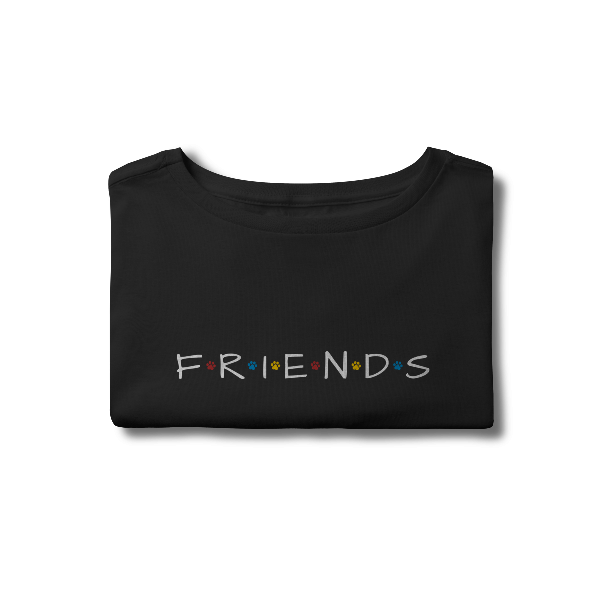 Porque amigos de verdade têm patas! Inspirada no logo icônico da série Friends, essa camiseta traz patinhas coloridas no lugar dos pontos, criando uma conexão única entre nostalgia e amor pelos dogs.