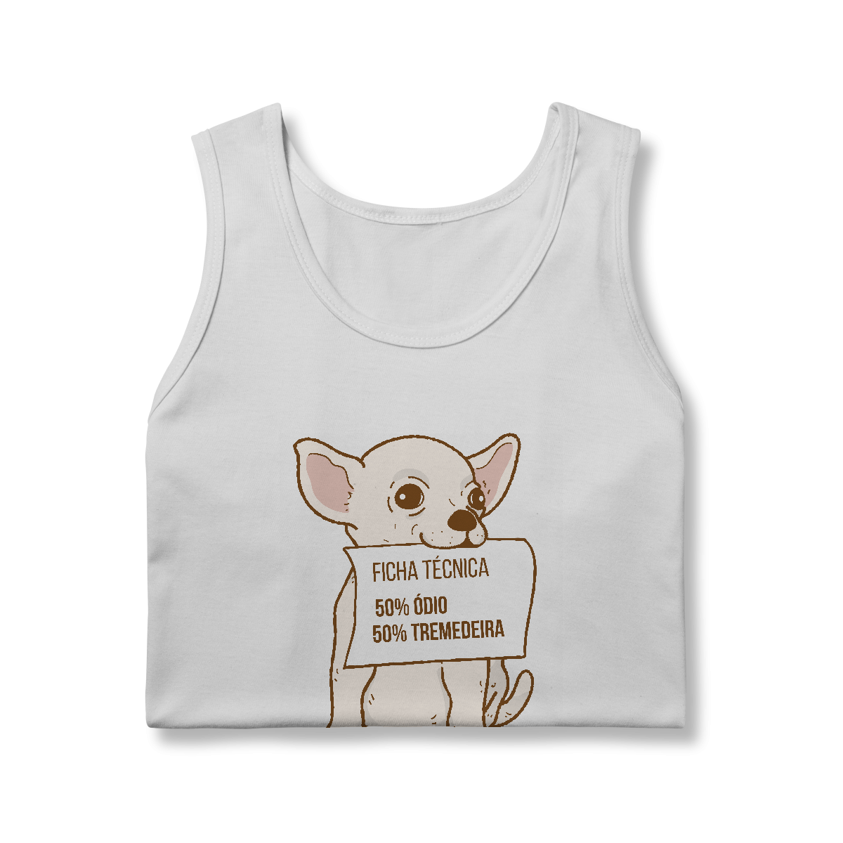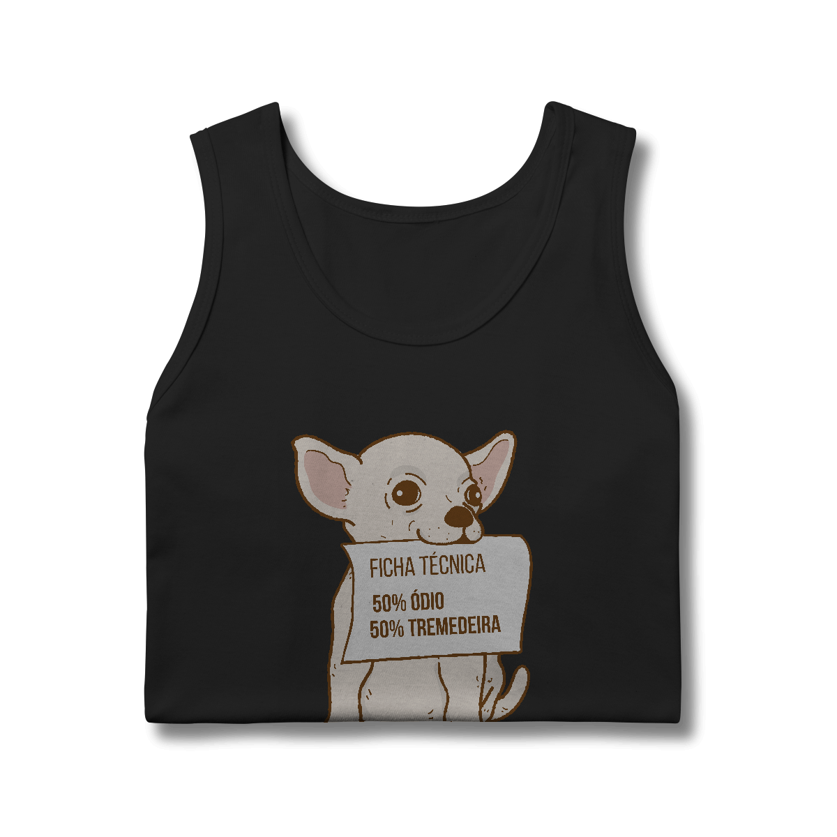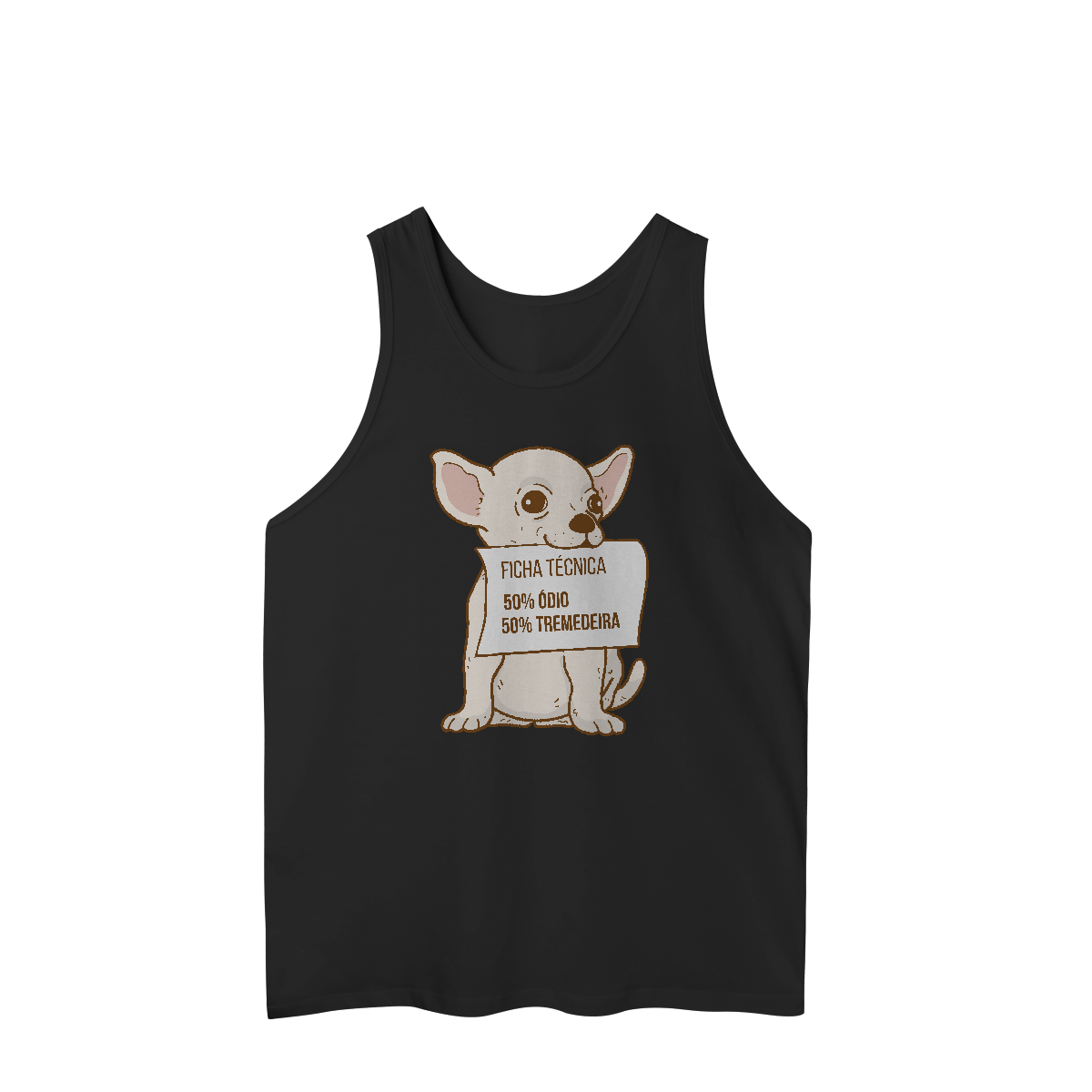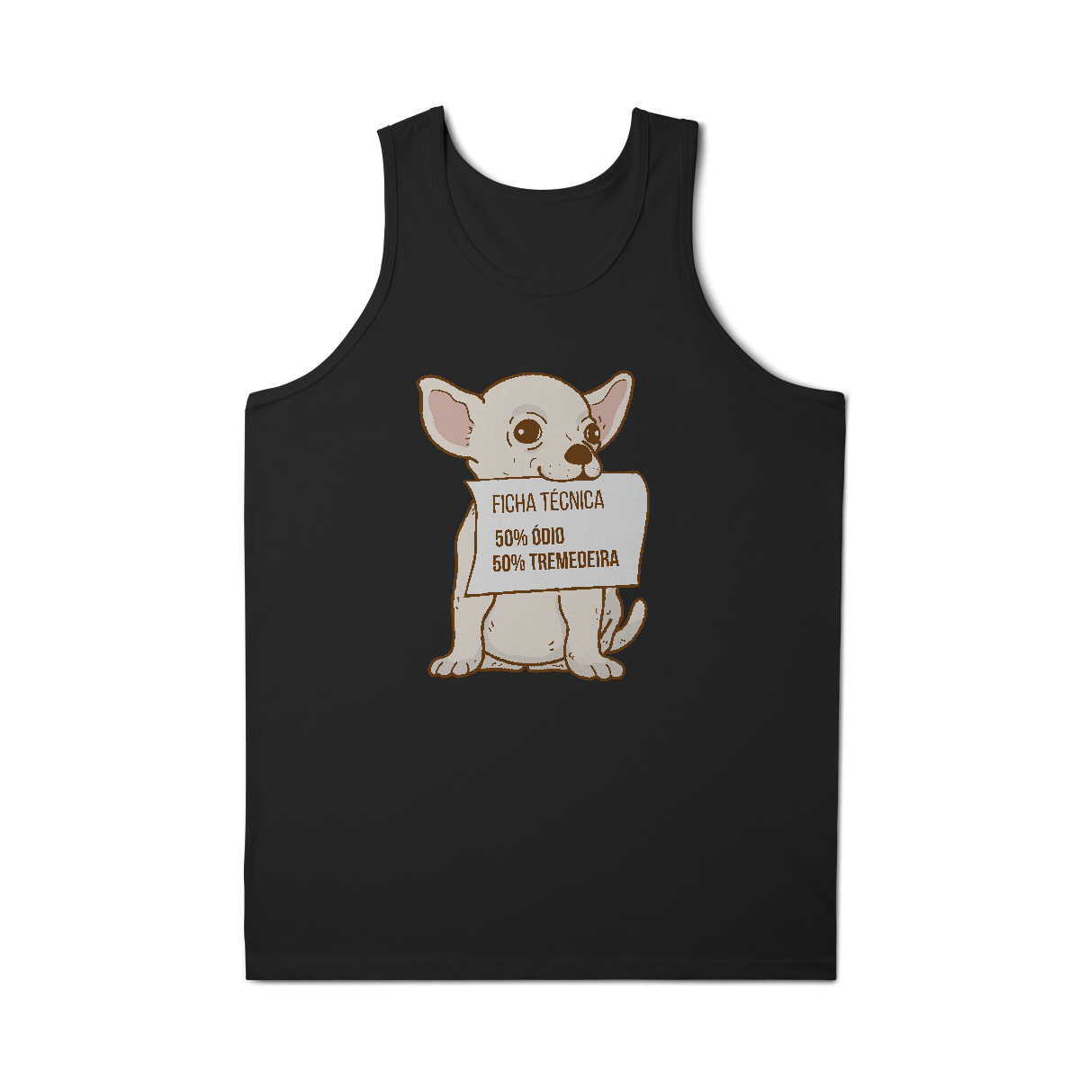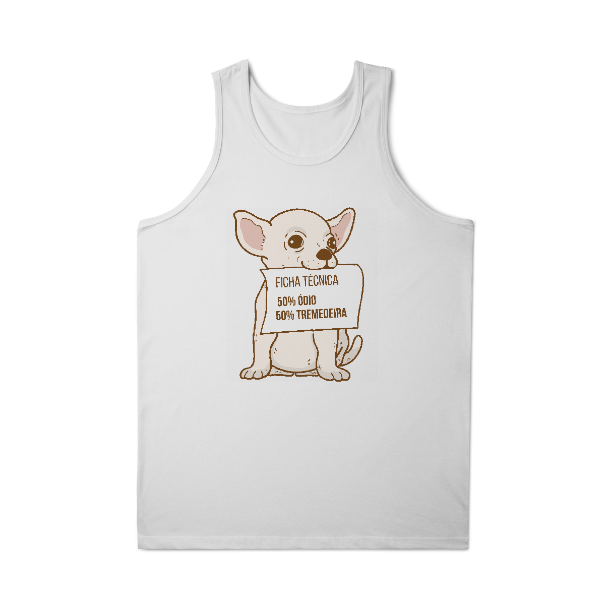 A Camiseta Chihuahua Ficha Técnica traz a ilustração divertida de um chihuahua segurando uma placa com sua “composição oficial”: 50% ódio, 50% tremedeira. Uma peça que mistura carinho e bom humor, perfeita para apaixonados por essa raça cheia de personalidade.
