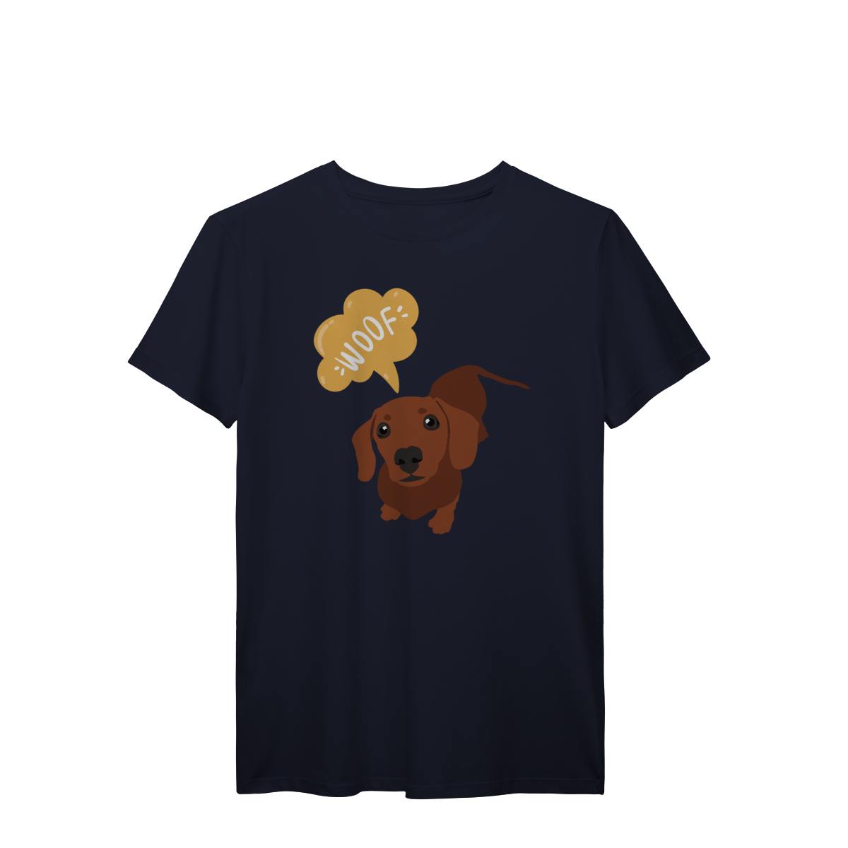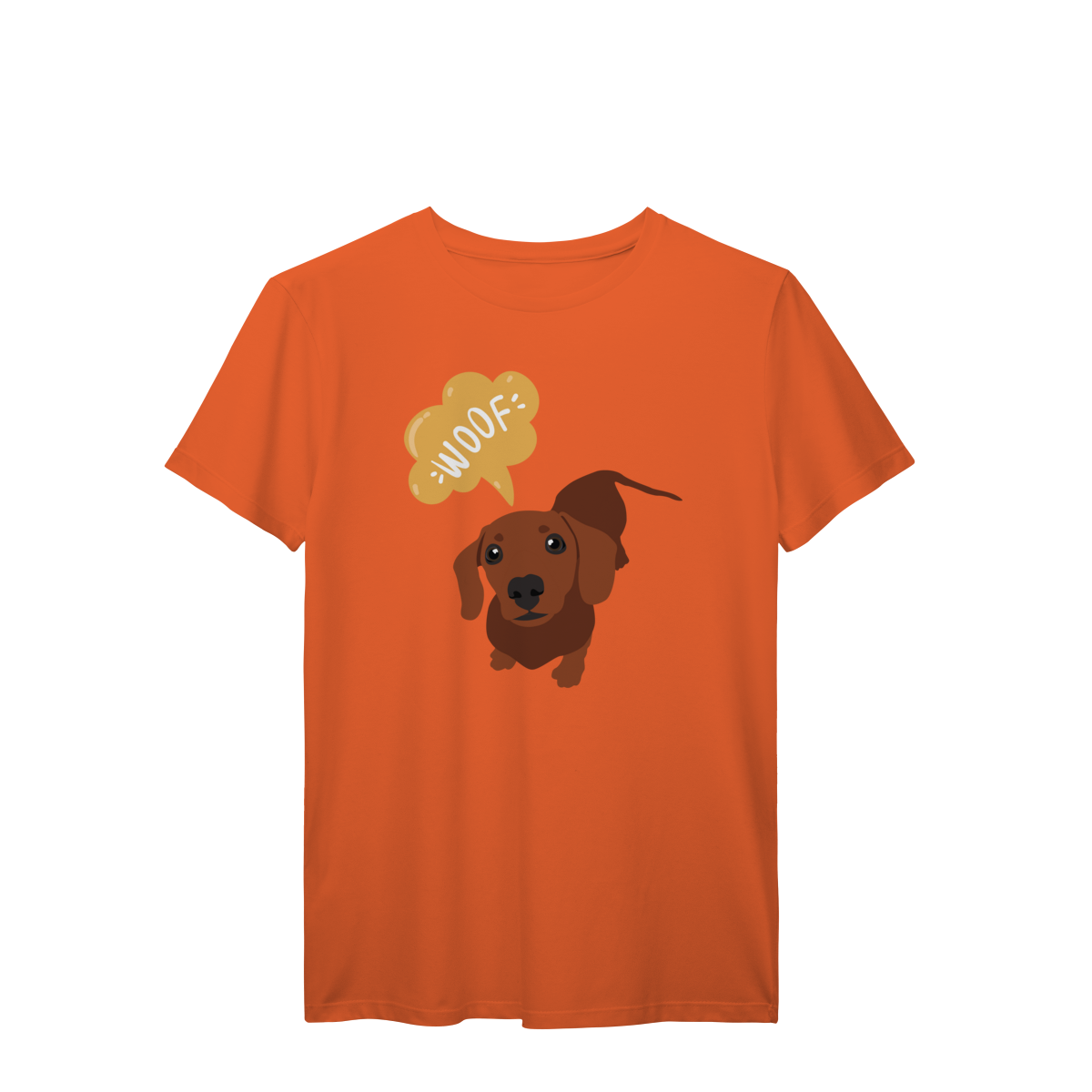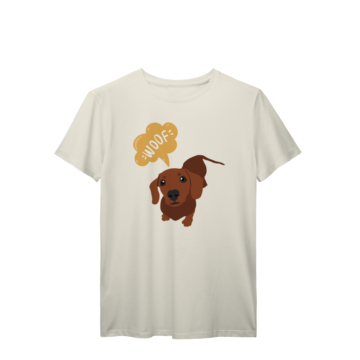 Essa estampa do dachshund marrom, dizendo “WOOF”, é puro carisma e foi feita pra acompanhar seus passeios e fotos com o dog.
