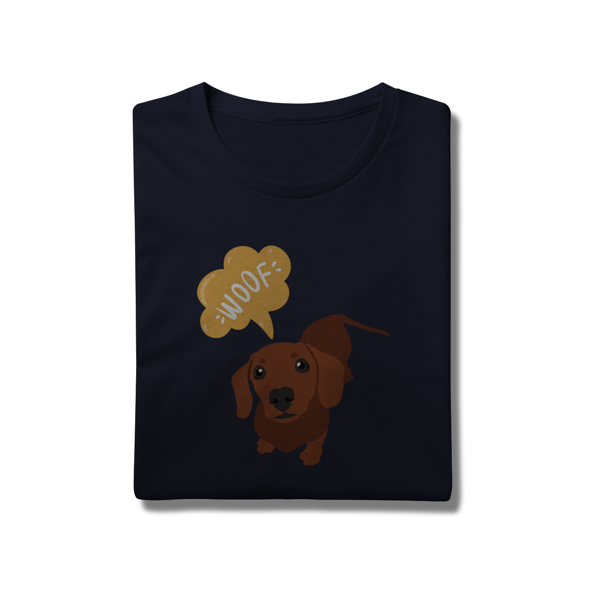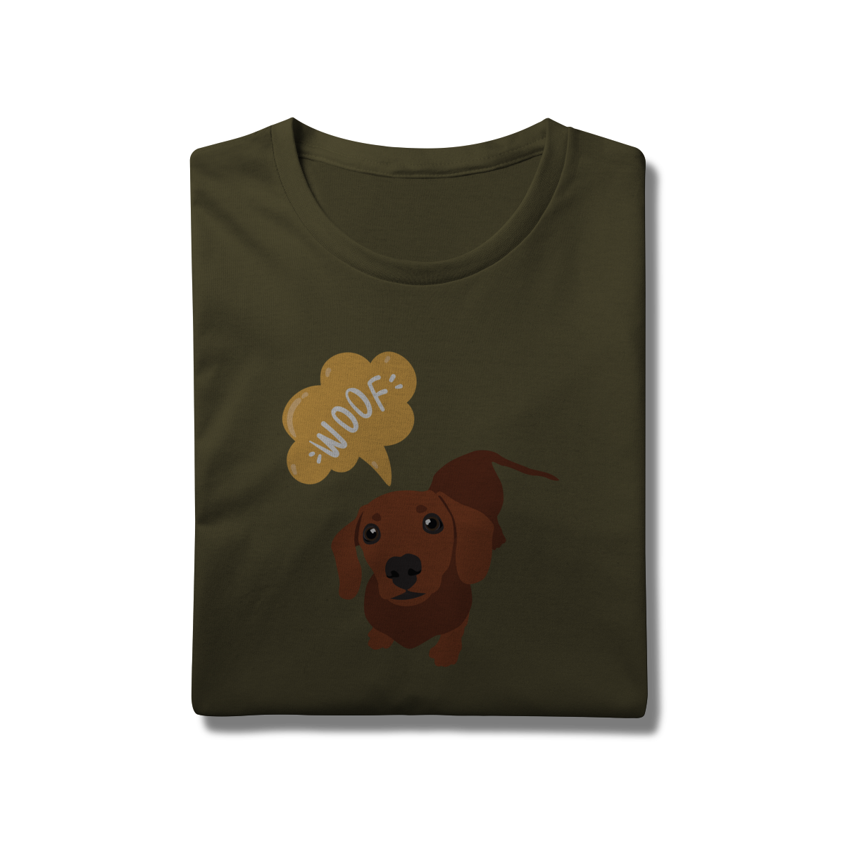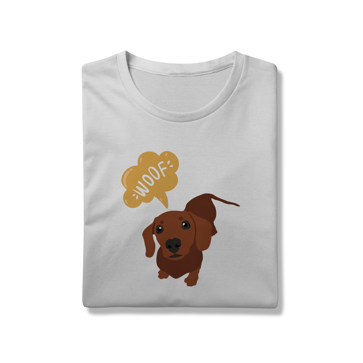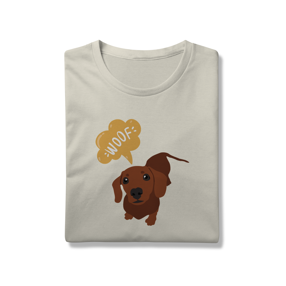 Essa estampa do dachshund marrom, dizendo “WOOF”, é puro carisma e foi feita pra acompanhar seus passeios e fotos com o dog.