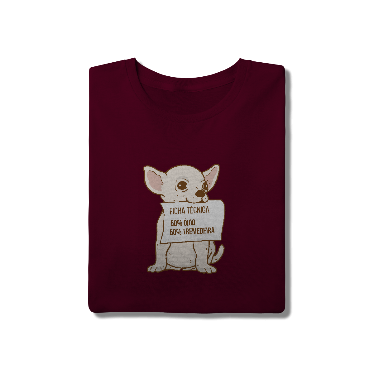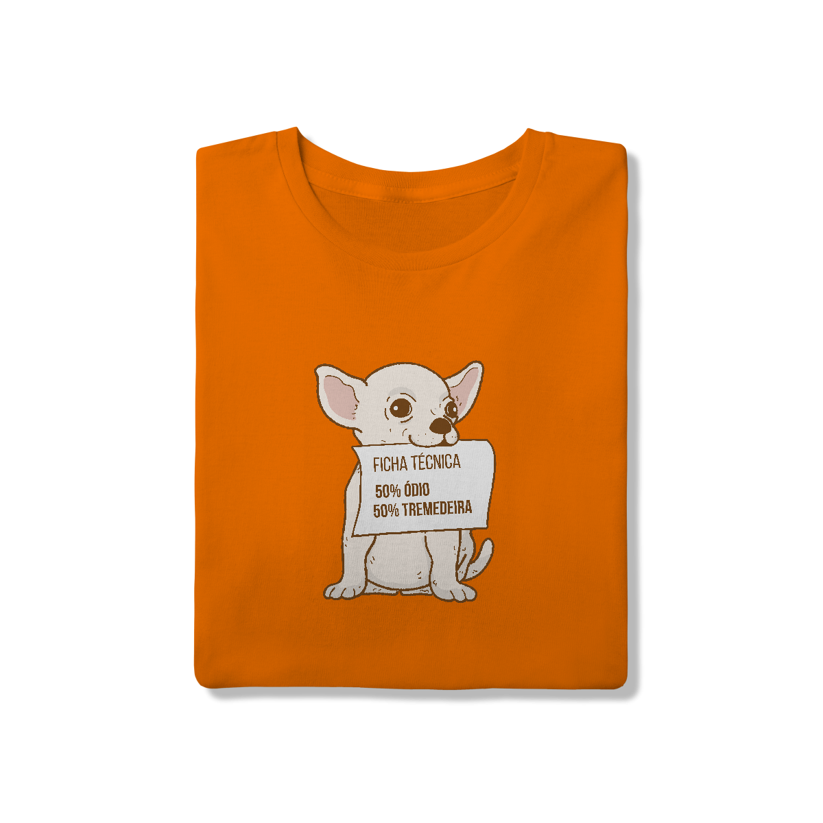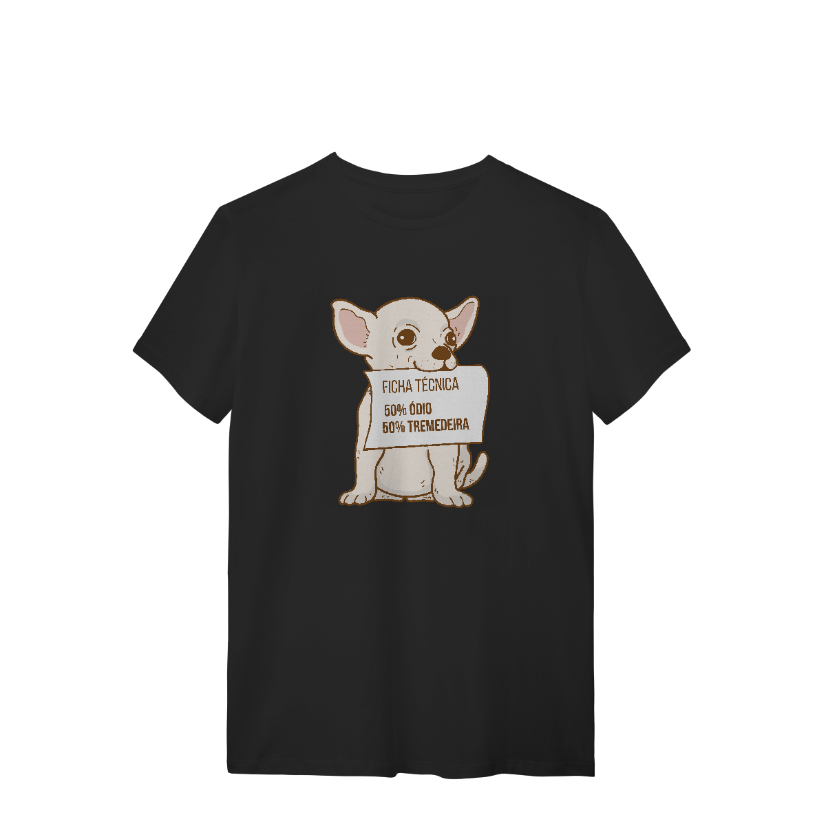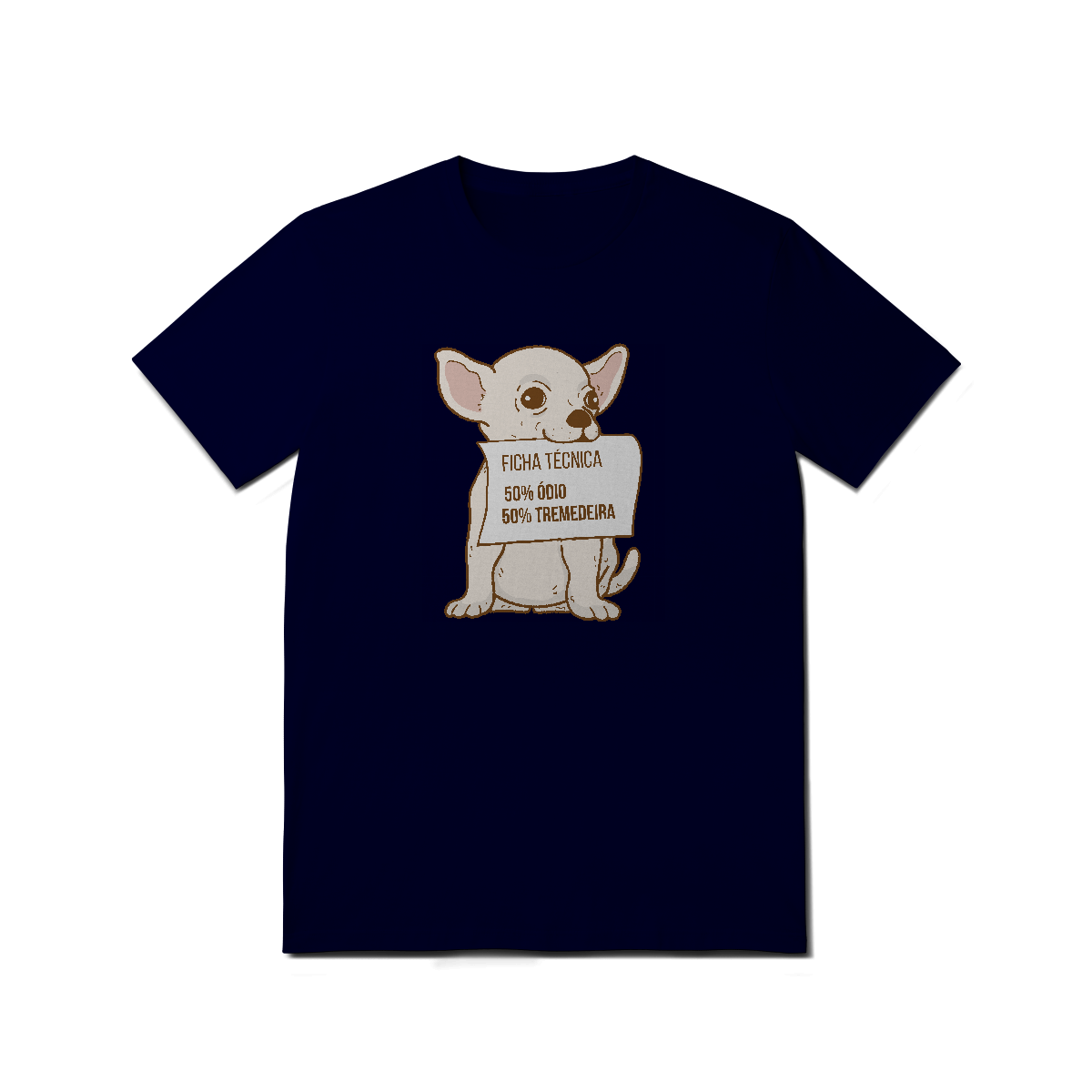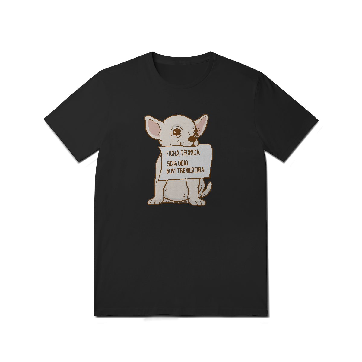 A Camiseta Chihuahua Ficha Técnica traz a ilustração divertida de um chihuahua segurando uma placa com sua “composição oficial”: 50% ódio, 50% tremedeira. Uma peça que mistura carinho e bom humor, perfeita para apaixonados por essa raça cheia de personalidade.