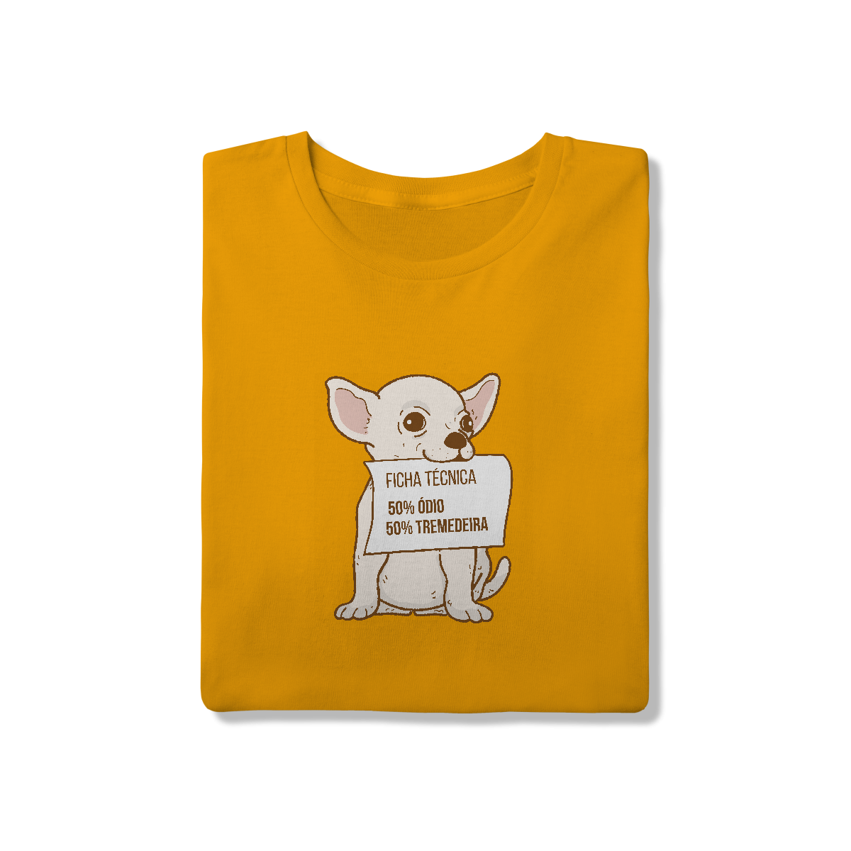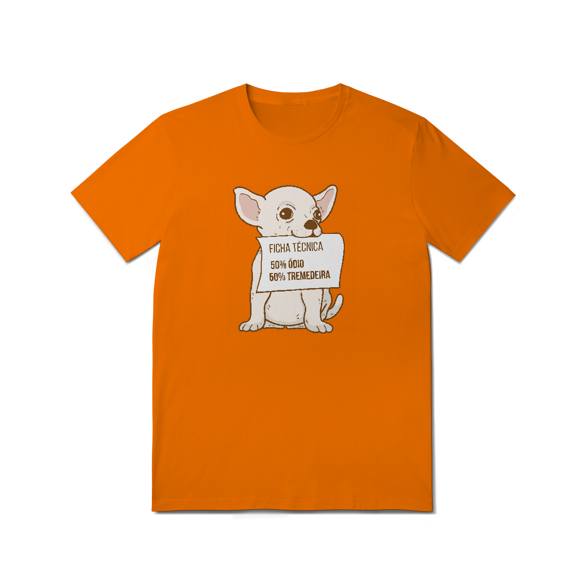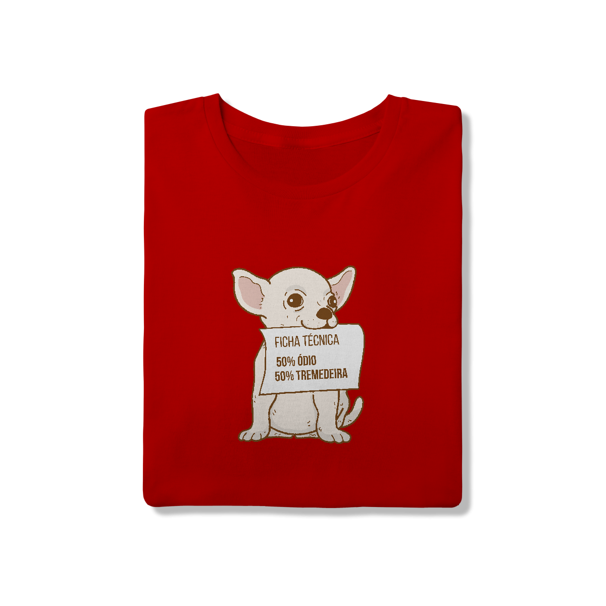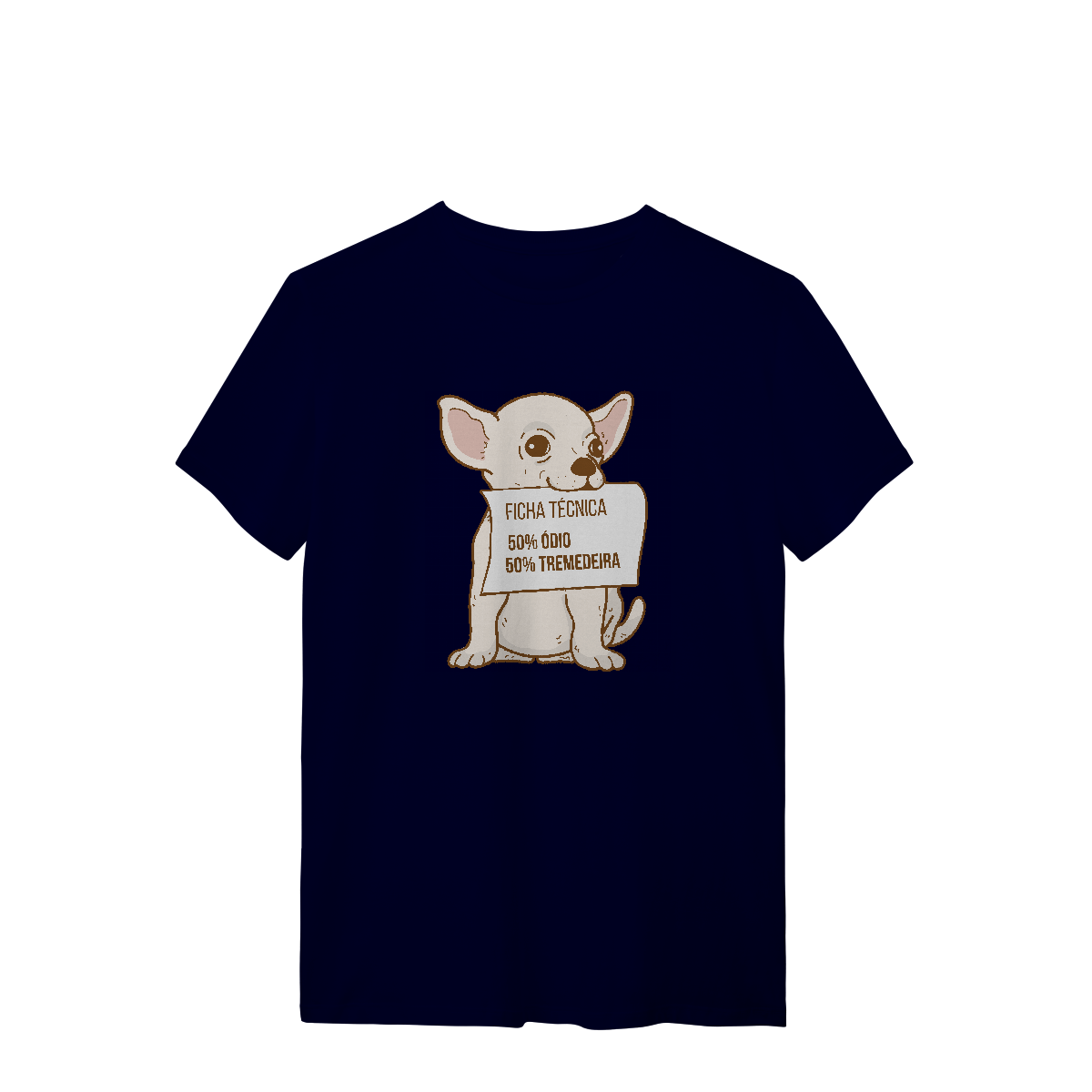 A Camiseta Chihuahua Ficha Técnica traz a ilustração divertida de um chihuahua segurando uma placa com sua “composição oficial”: 50% ódio, 50% tremedeira. Uma peça que mistura carinho e bom humor, perfeita para apaixonados por essa raça cheia de personalidade.