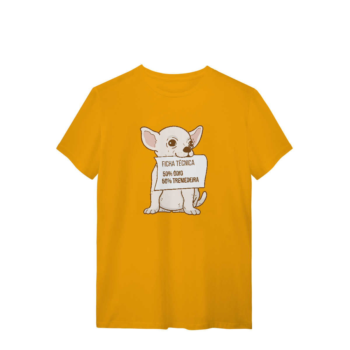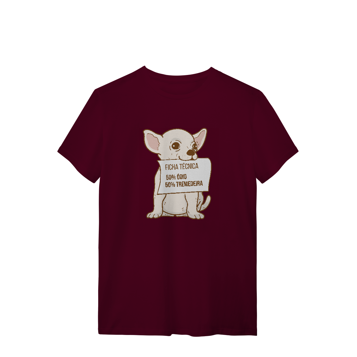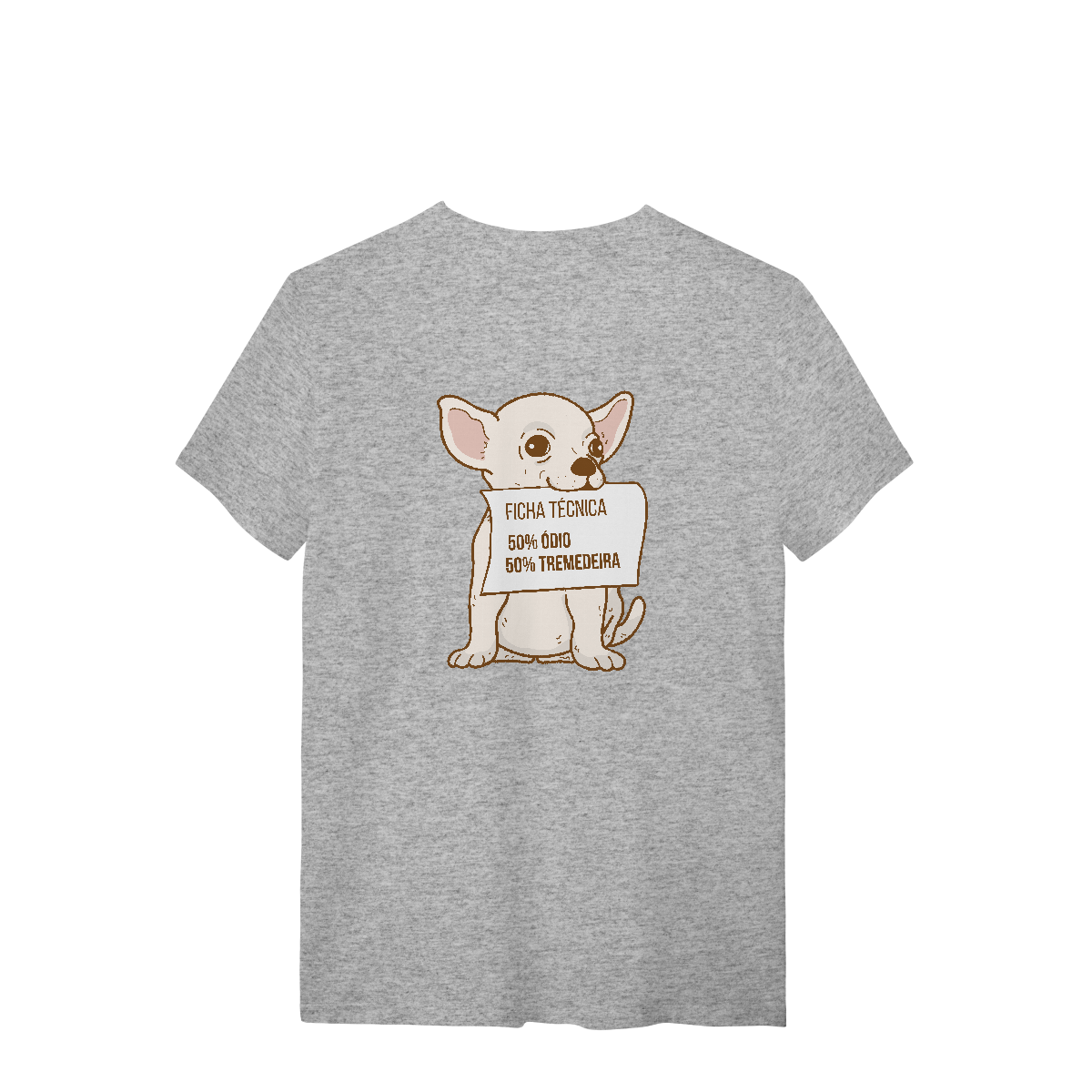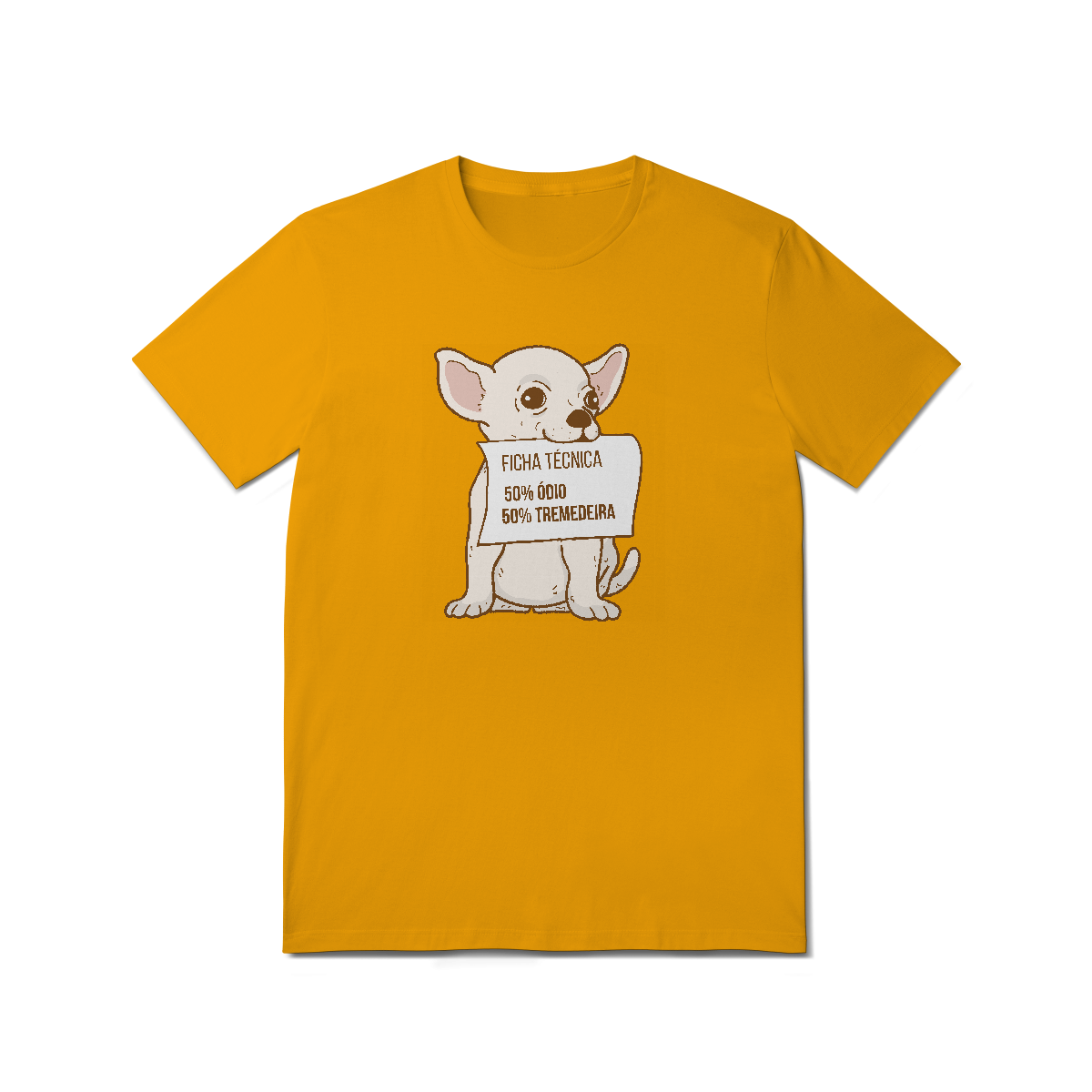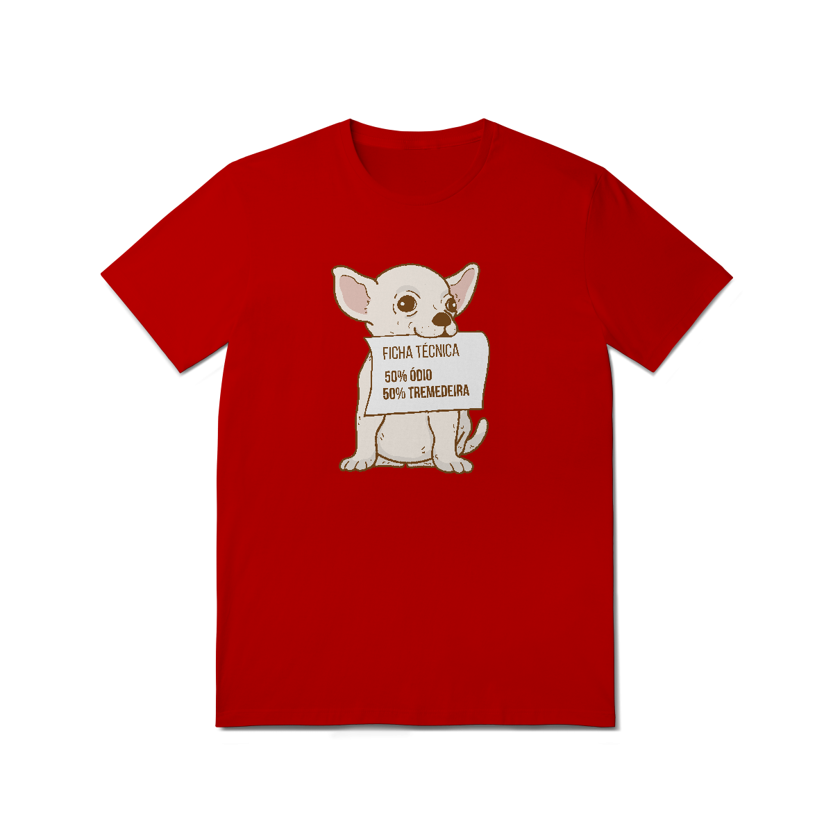 A Camiseta Chihuahua Ficha Técnica traz a ilustração divertida de um chihuahua segurando uma placa com sua “composição oficial”: 50% ódio, 50% tremedeira. Uma peça que mistura carinho e bom humor, perfeita para apaixonados por essa raça cheia de personalidade.