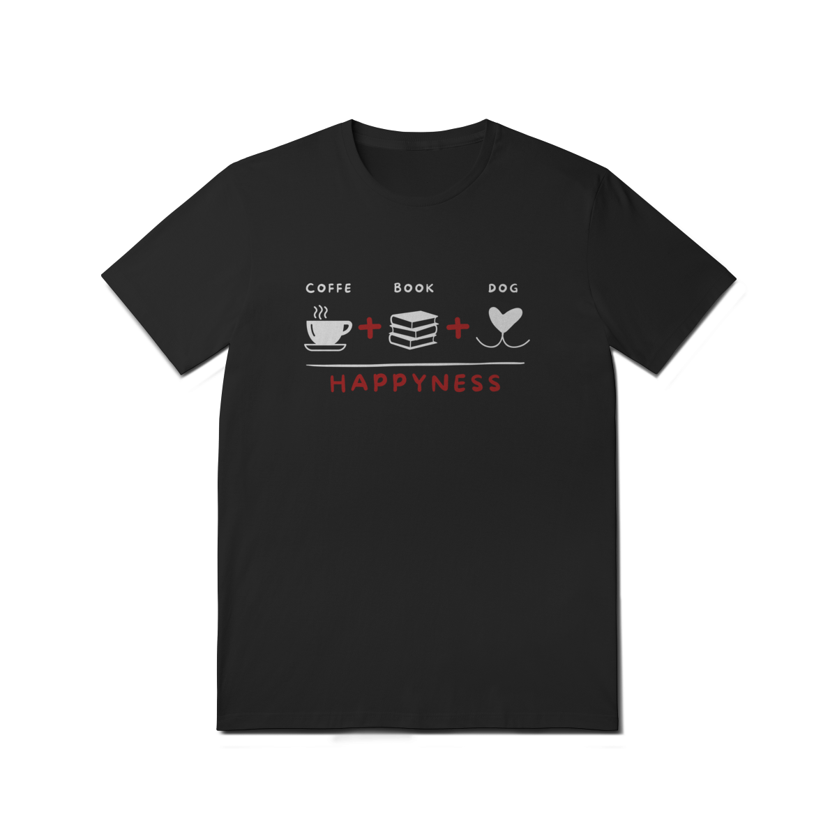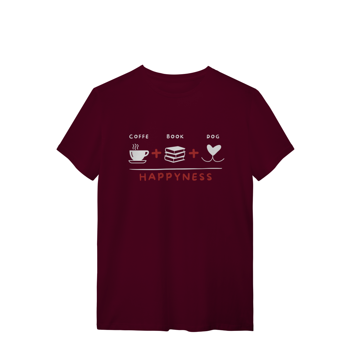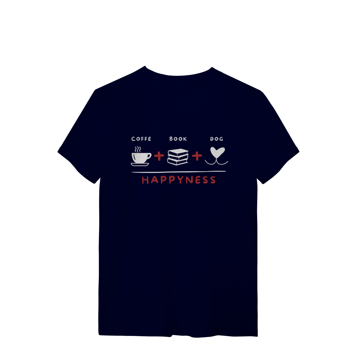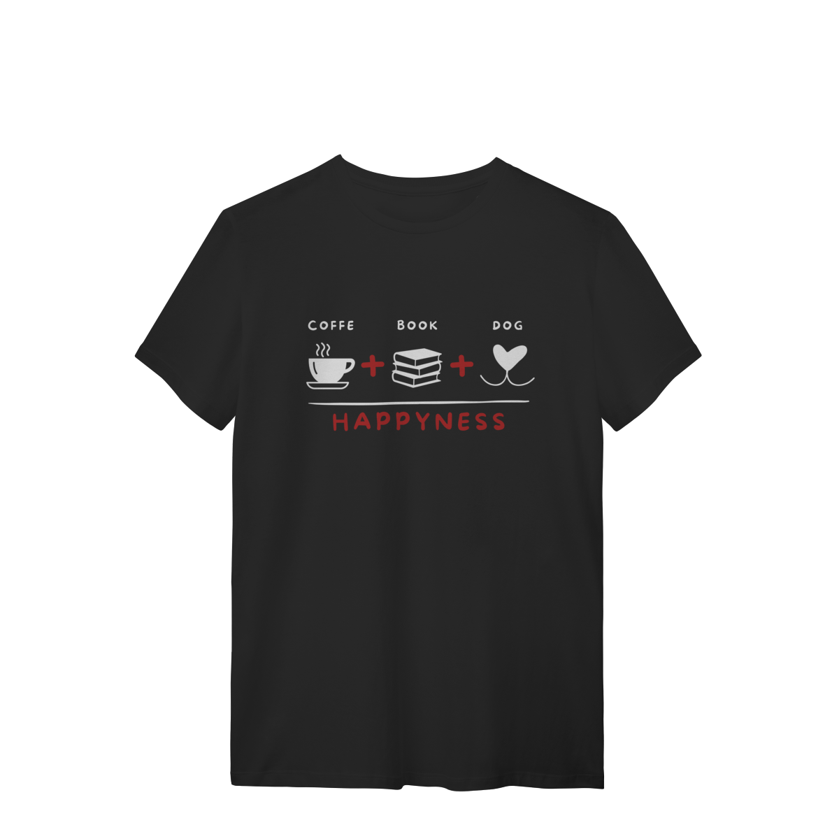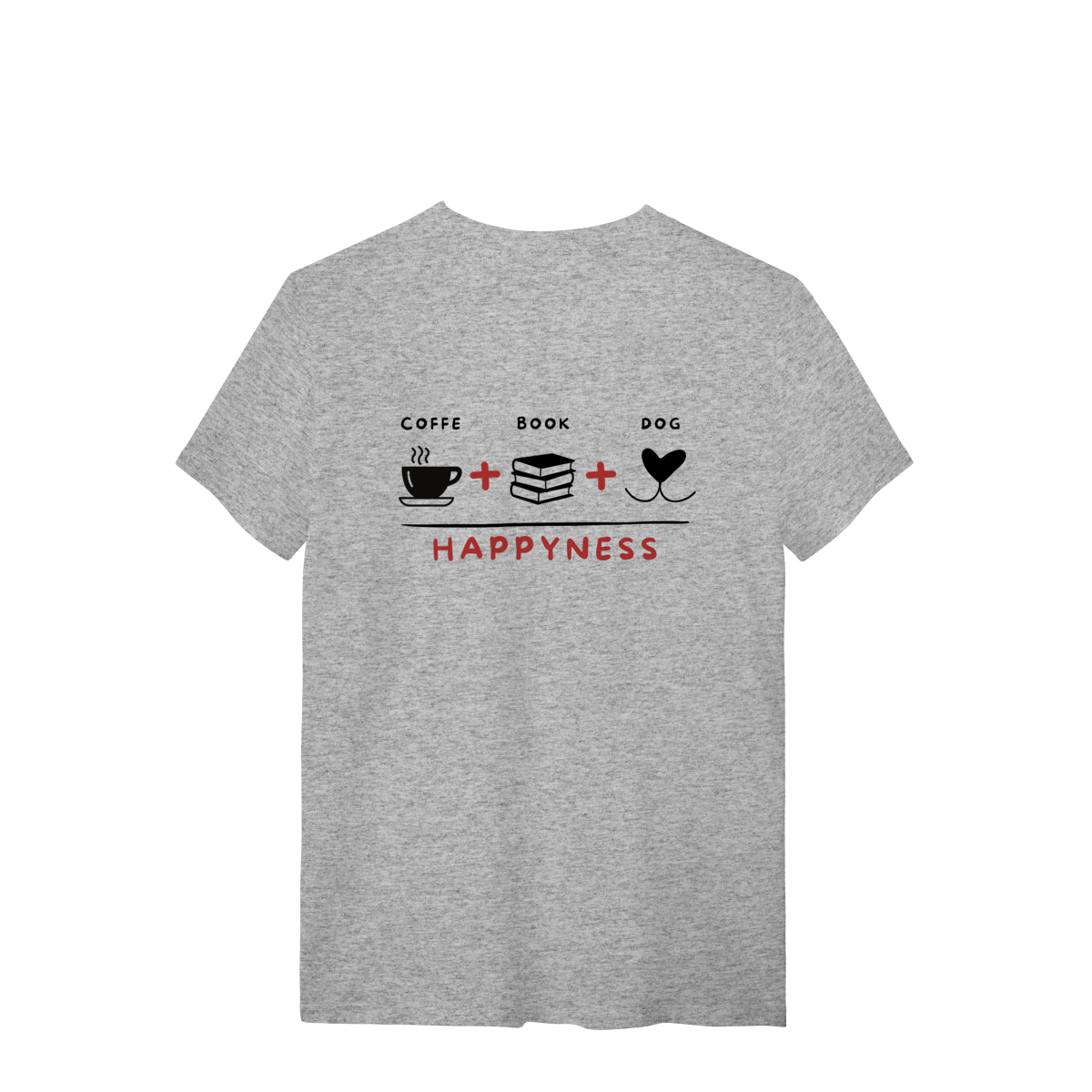 A Camiseta Happyness combina três paixões universais: café, livros e cachorros. Com estampa divertida em estilo minimalista, ela traduz de forma leve o que realmente importa para quem ama pequenos prazeres que tornam o dia completo.