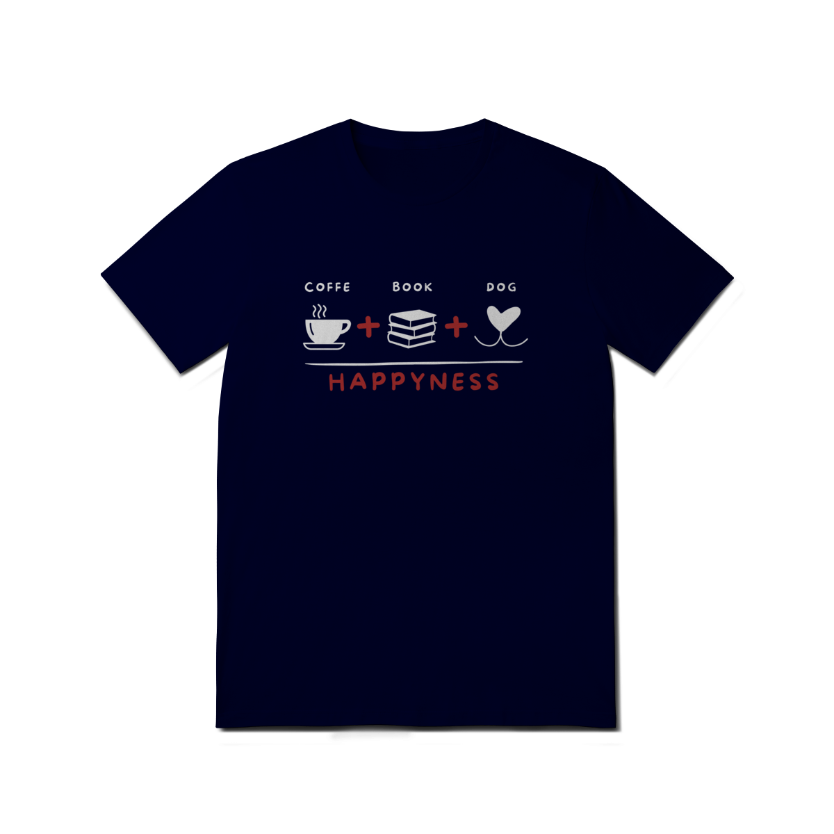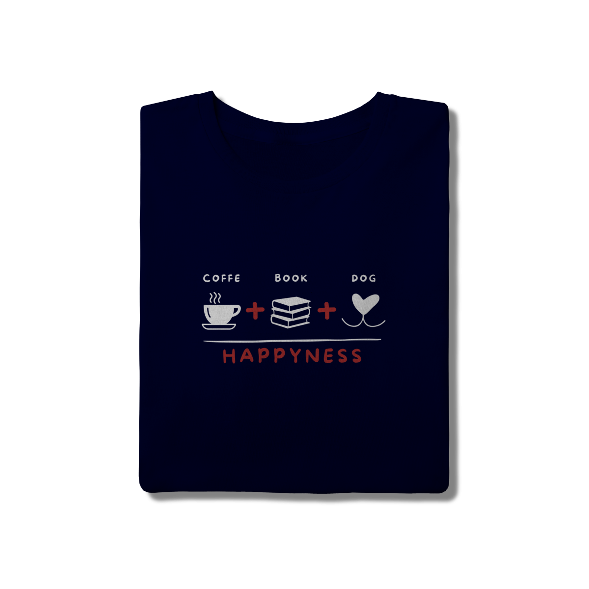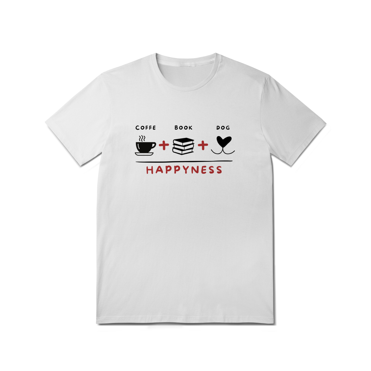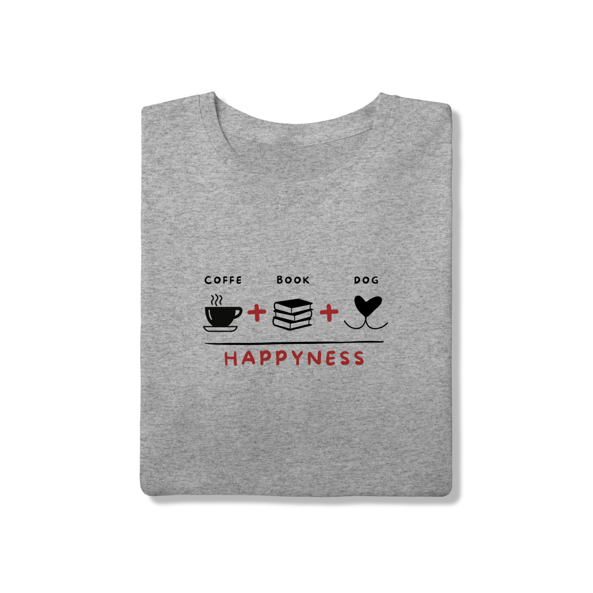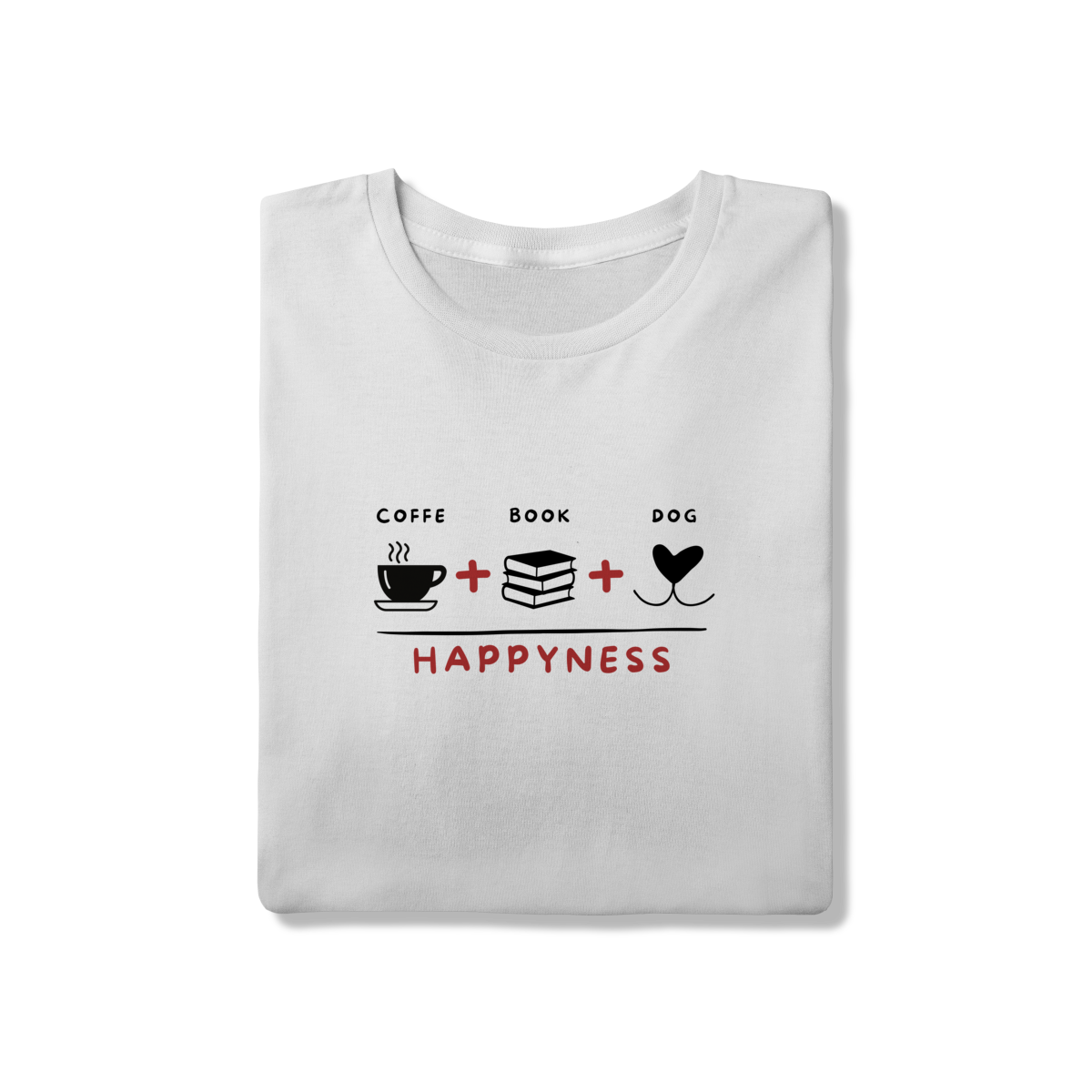 A Camiseta Happyness combina três paixões universais: café, livros e cachorros. Com estampa divertida em estilo minimalista, ela traduz de forma leve o que realmente importa para quem ama pequenos prazeres que tornam o dia completo.