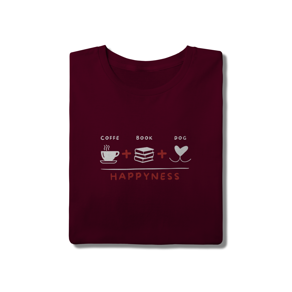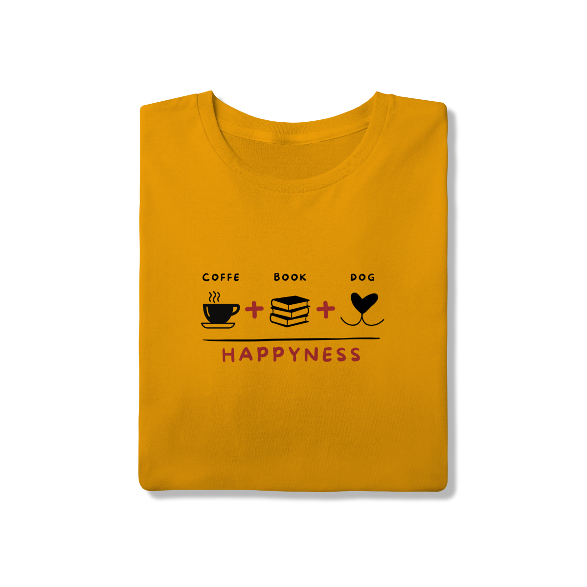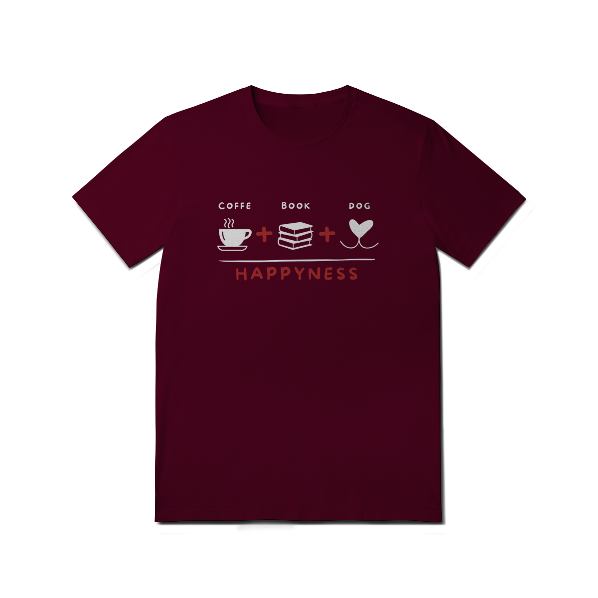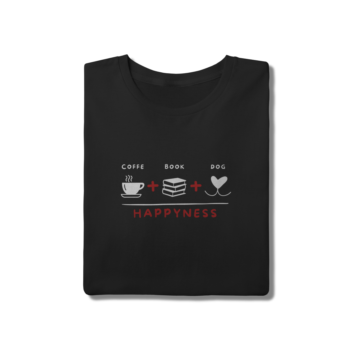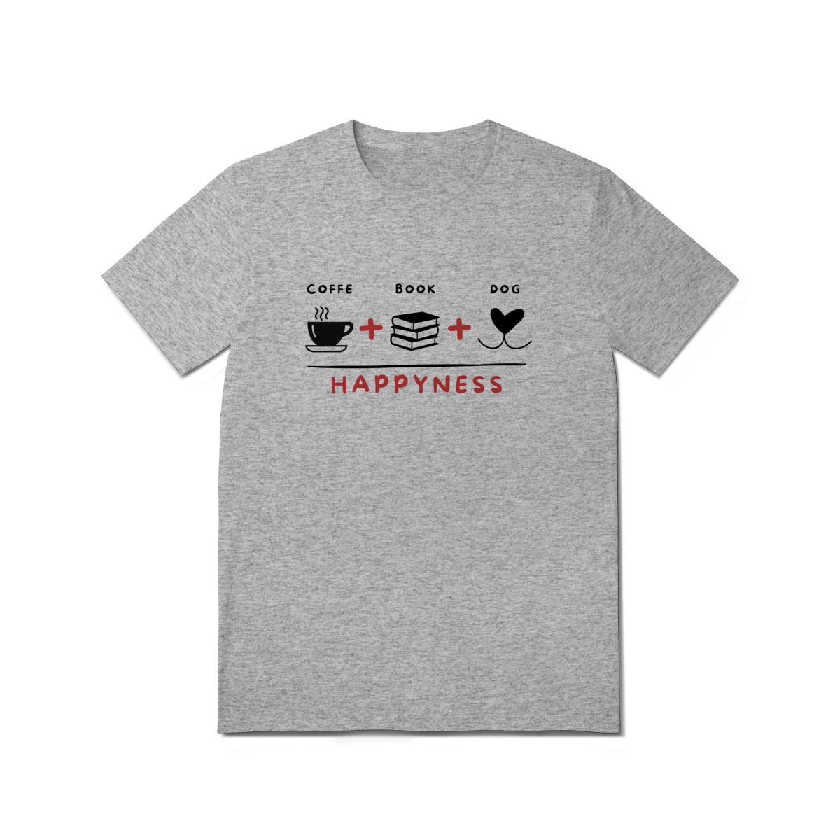 A Camiseta Happyness combina três paixões universais: café, livros e cachorros. Com estampa divertida em estilo minimalista, ela traduz de forma leve o que realmente importa para quem ama pequenos prazeres que tornam o dia completo.